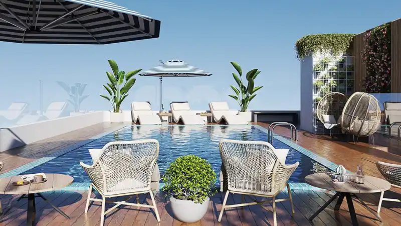 and tiles. Every home consists of a range of amenities which combine to bring some sense of tranquillity from Al Barari’s lush greenery, and serene landscapes of Dubai, where the benchmark of urban living is set high. The style and functionality fusion makes every minute for comfort and luxury. The façade recreates the meaning of leisure and recreation with its amenities set, where residents can have it all from the rooftop gym and swimming pool to a calm sun-sitting zone.