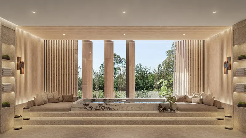 both interiors and exteriors to their tastes. This bespoke approach ensures that each home is a unique reflection of its owner’s personality. The sunroom in the garden, an exclusive feature enhances this personalization, providing a serene space bathed in natural light. The use of state-of-the-art finishes and high-quality materials, combined with the award-winning designs, results in homes that are both functional and visually stunning. Every element, from the lighting to the choice of materials like stone, glass, and aluminium is chosen to create a tranquil and relaxing atmosphere. The seamless integration of indoor and outdoor spaces through floor-to-ceiling windows allows residents to enjoy nature's beauty while indulging in luxurious comfort.