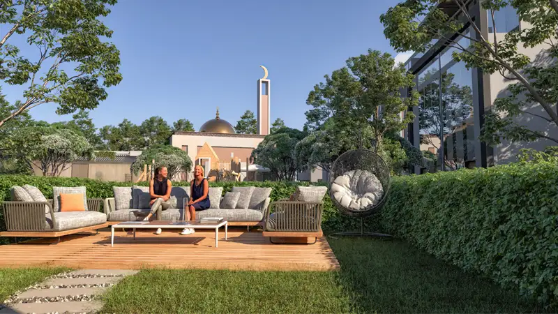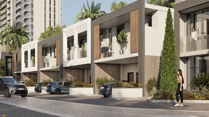 lifestyle with grandeur, innovation and unparalleled luxury. Lined with 293 townhouses and 392 apartments offering a wide range of options, presenting a lifestyle destination, designed for those who value privacy, luxury and convenience. The modern architecture meets the tranquility of lush greenery, where every element is meticulously crafted to reflect a balance between urban sophistication and natural beauty. Situated in Dubai Investment Park, it offers the perfect balance between convenience and exclusivity. The locality is a thriving mixed-use community, combining residential, commercial, and industrial spaces. Covering over 2,300 hectares, this eco-friendly development is designed to meet the needs of residents and businesses alike. Strategically located near Expo City and Dubai Marina, it provides easy access to Dubai’s key economic hubs. Major highways, including Sheikh Zayed Road and Emirates Road, ensure that residents are well-connected to the city’s core while enjoying a peaceful, serene environment away from the urban hustle. Whether you’re looking for a compact, stylish apartment or a spacious townhouse for your family, the complex offers a range of options tailored to your needs. The exteriors feature clean lines, modern finishes, and a subtle earth-tone colour palette. Wood accents add a warm, natural touch, creating a seamless integration of nature and architecture. The overall design echoes the spirit of Dubai’s vibrant urban landscape while providing a sanctuary of peace and relaxation for its residents. Inside each residence, the design reflects commitment to luxury and functionality. High-quality finishes, contemporary designs, and a neutral colour palette create a sense of sophistication that appeals to those with refined tastes. The kitchen features modern cabinetry and durable countertops, offering both style and practicality. The bathrooms are fully tiled with high-end finishes,