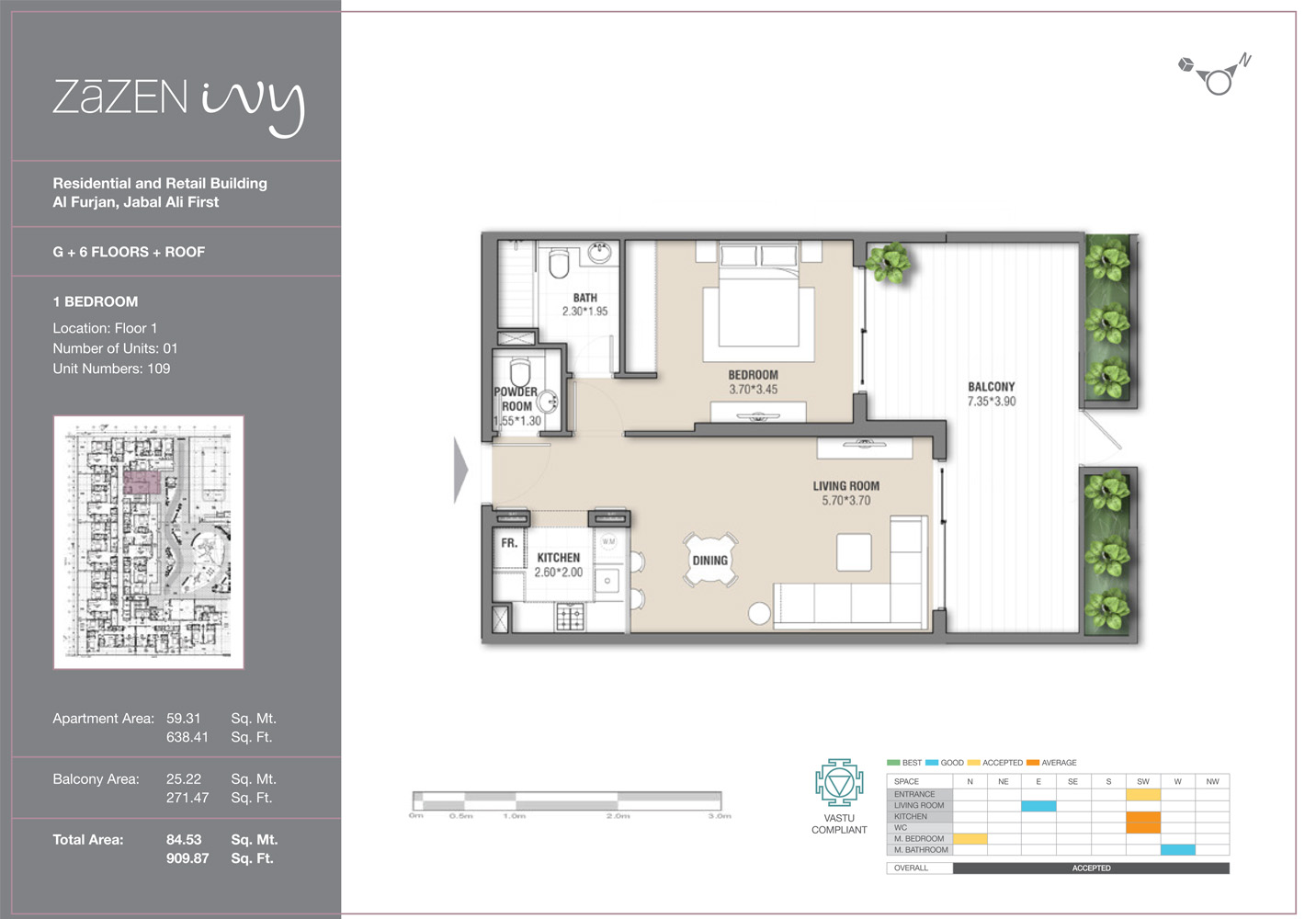 grace—as its inspiration. It has been designed with a deep sense of responsibility toward sustainable development and strives to merge eco-friendly parameters within its structure. The development also strives for LEED certification and incorporates Vastu principles within its design. High speed elevators, complete security systems, and energy-efficient common areas that are powered in part by solar energy are other highlights of this building. In addition, pet-friendly policies along with Wi-Fi in the common areas really make for excellent added living. Within its G+6+R+Upper Roof structure, there are 71 thoughtfully designed units, with apartment ranging from 1 to 3 bedrooms, with their sizes varying from 717 to 2,200 square feet. Each unit is uniquely fitted with functional living areas for both the 1- and 2-bedroom variants, while the 3-bedroom apartments come with an added maid's room, large kitchen spaces, and balconies or terraces. Also, there are 3.2-meter-high ceilings that extend space upward, premium tile flooring underfoot, custom-crafted wardrobes, and double-glazed windows fitted with sliding doors allow every corner of each room to flood with natural light. Kitchens are outfitted with features like professional grade appliances and quartz stone countertops to make them livelier. The bathrooms have vitrified porcelain tiles and Australian mixer sanitary ware for a classy experience. The property is seamlessly connected to the rest of Dubai. Having Gardens Metro Station and Ibn Battuta Mall next door and vibrant locales like JBR,