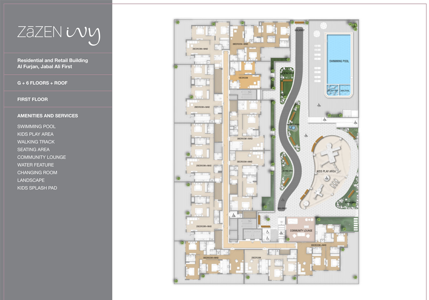 Zāzen Ivy is an innovative 9-story building being developed in Al Furjan , Jebel Ali District. This project mirrors the spirit of growth, harmony, and vitality in each aspect of its concept, with the ivy plant-known for its strength and