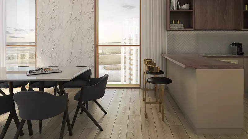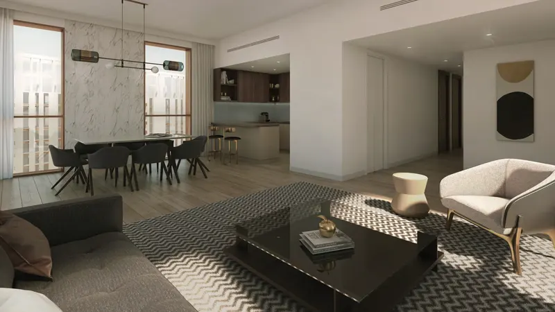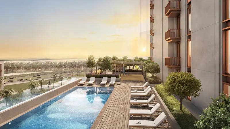 towers copy each other with elegant facades that make a bold statement on the skyline, a tailored urban park sets the scene for picnics, barbecues, and outdoor fitness. It offers convenient access to world-class retail and hospitality, health and education services nearby, including the Rosewood Hotel, Four Seasons, Galleria Mall, and Cleveland Clinic. The residents can find five floors up in each tower, a podium level houses a state-of-the-art gym