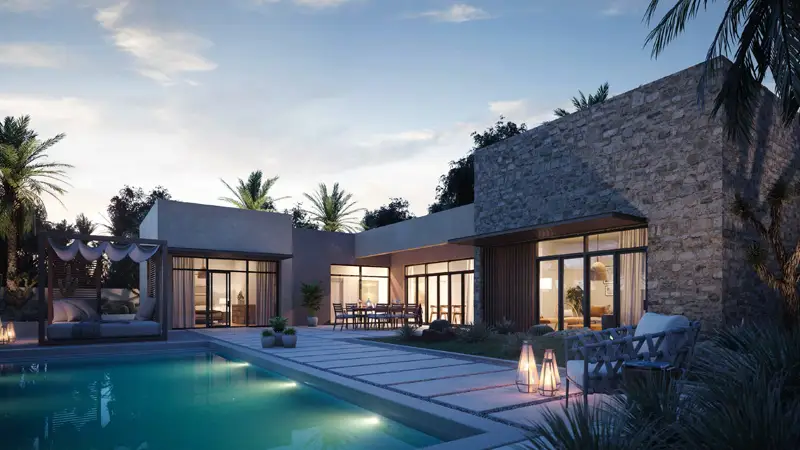 villas design are being inspired by the basic elements of the Arabian desert tent that both creates shelter and provides shade with its modular, open and linear concept. The development provides sanctuaries with blissfulness, fulfillment and soul enrichment where the residents can feel safe and free to find inner peace. It is located away from the bustling crowds and quickly paced city with a private and gated entrance. It is nestled between most pristine coastline in the Emirates, which provides imagination, heritage and natural