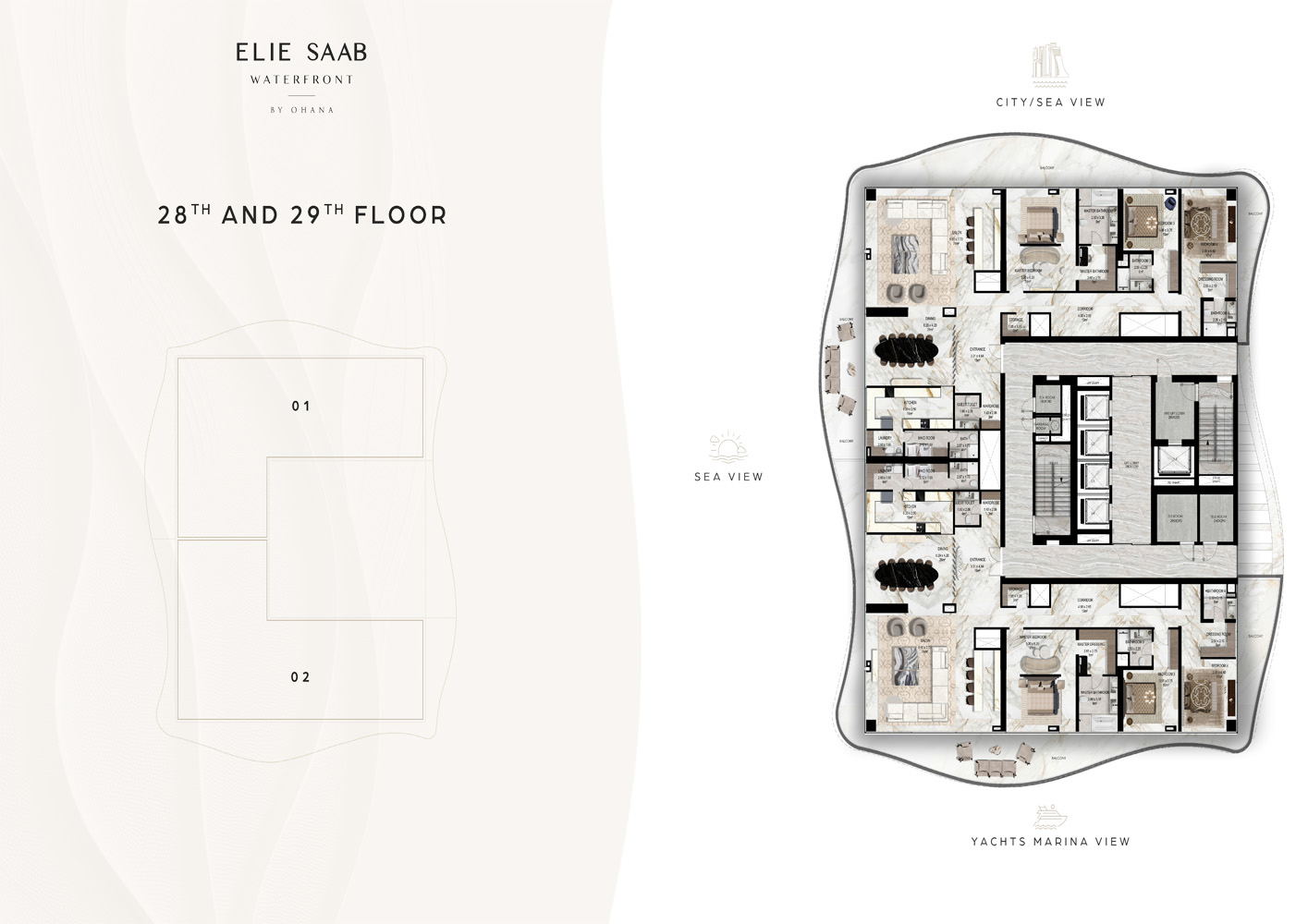 residences, enveloped in an atmosphere of opulence and refinement. The collaboration between Ohana Development and renowned fashion designer Elie Saab sets a new standard in luxury real estate, where each detail is meticulously crafted to exude pure beauty and sophistication. Located in one of the Abu Dhabi’s most coveted waterfront location in Al Reem Island, the waterfront development offers panoramic views of the gulf and yacht marina. Its proximity to the top-rated schools, world-class shopping destinations including Reem Mall and The Galleria, and renowned healthcare ensures that residents enjoy the best of luxury and convenience at their doorstep. With direct access to the major thoroughfares and prominent universities, it epitomizes the pinnacle of urban living. From the moment one step in the development, it becomes evident that this is more than just a residential façade – its work of art. The meticulously designed interiors, adorned with superior furnishings curated by Elie Saab, exude grace and elegance at every turn. Every detail, from sleek materials to the textured fabrics, tells a story of luxury and refinement. With its fluid contours inspired by the ocean waves and the timeless elegance synonymous with the brand, offering a lifestyle of unparalleled opulence. As the day begins, residents are greeted by the tranquil beauty of the waterfront view. Whether starting the day with a workout in the state-of-the-art gym or finding serenity in the yoga/wellness space, every moment is an opportunity to rejuvenate mind, body, and soul. And as the day comes to a close, residents can gather with family and friends in the communal areas, creating memories against the backdrop of the stunning Abu Dhabi skyline. The amenities redefine luxury