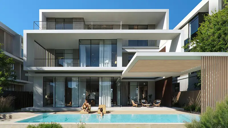combines the qualities of modern sophistication with nature in an exceptional waterfront living concept. The residential development rests between Abu Dhabi and Dubai as it offers peaceful living with convenient access to major UAE locations. This sanctuary harmoniously integrates with nature featuring pristine landscapes together with panoramic ocean views that include a secluded nature reserve. The development presents its residents with exceptional elegant residences that deliver incredible seascapes and broad green spaces under designs that draw inspiration from local architectural traditions. The façade is nestled on the renowned Sahel Al Emarat’s untamed coastlines while providing residents with easy access to the area. This premium community faces both Abu Dhabi and Dubai metropolitan cities while providing residents with peaceful living without compromising their connection to surrounding areas. Residents attain quick access to Zayed International Airport together with Al Maktoum International Airport, while they can quickly drive to Saadiyat Island and Atlantis the Palm. Residents experience dual access to a vivacious metropolis together with natural relaxation just across their path. Within the beachfront Island locale, the façade stands poised to take a position as one of the UAE's premier waterfront developments through its perfect architectural unity and exceptional lifestyle facilities. The architecture draws inspiration from the original spirit of cultural tradition to create an innovative design which merges modern elements with heritage elements. The extra-ordinary collection comes with its 08 residential building complex with apartments and duplexes at service, complemented by exclusive four types of villas. Explore the different villa style façades as Somer, Tala, Acacia and Canal Villas, on the other hand, the townhouse façades in two styles with Sikka and Alghaf townhouses. Plentiful glass walls let daylight pour into the building interiors, whereas the courtyards, shaded pathways and terraces establish a feeling of luxurious outdoor living. As soon as you walk through the entrance, the space reveals a refined atmosphere where peacefulness embraces you. Quality remains the interior focus point through custom timber products, rattan-patterned decorative walls along with elaborately detailed millwork installations. The depth and