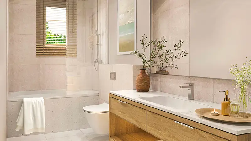 Masdar City and Al Ghazal Golf Club. The community offers natural habitat a place, where many wild specious find their home within the natural reserve, protecting the eco-system and the natural life. Contemporary design and sustainable living presents this living icon, setting beside the leisure and high-end details. Premium finishes, luxurious and spacious layouts and innovative features are crafted to meet luxury and comfort of each residence. The project complies with global sustainability standards and use eco-friendly materials and efficient water fixtures to promote environmentally conscious living.