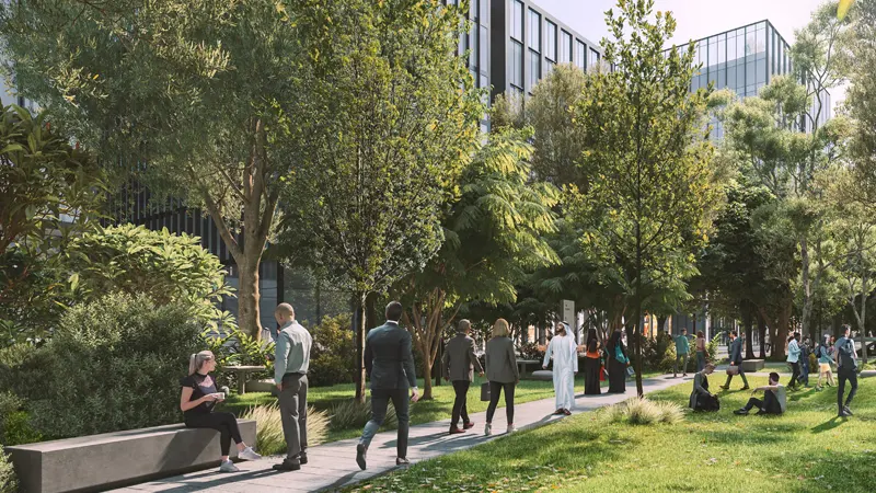 cater to the evolving needs of progressive corporations. Its strategic location overlooking the green spine makes it an ideal choice for forward-thinking businesses looking to thrive in a sustainable and employee-friendly environment. The development offers more than just office spaces; it fosters a culture of collaboration and well-being. With wide, open floor plans and floor-to-ceiling windows allowing ample natural light, the workspace of tomorrow is here today. Green rooftop terraces provide venues for outdoor meetings, events, and networking, complemented by juice bars and yoga zones to promote employee health and wellness. Connectivity is key in today's fast-paced world, and it delivers on all fronts. Situated within easy reach of Sharjah International Airport and Dubai International Airport, with direct access to major roadways, the district offers unparalleled accessibility for businesses and travelers alike. Moreover, its proximity to key landmarks such as University City, Sharjah Airport Free Zone, and City Centre Al Zahia mall further enhances its appeal as a prime business destination. In addition to its strategic location and modern amenities, the building is committed to sustainability and environmental stewardship. Every office within