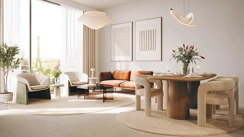 and innovative sophistication. This dynamic and visually compelling design features a diverse choice of homes’ layouts. Each residence is planned mindfully to deliver the best style, comfort, and stunning views of the landscapes and nature-inspired privacy. This complex is a part of the towering cluster nestled beyond the main entrance with a yard, including world-class amenities, lush greenery, and a dancing fountain. In Dubai South, the façade occupies a key position in one of the city’s fastest-developing districts. Global travellers and professionals will appreciate this address, just 9 km away from Al Maktoum International Airport and 21 km away from Expo City Dubai. Places such as Ibn Battuta Mall, Palm Jebel Ali and Dubai Marina are very close and each features a unique lifestyle, shops and entertainment choices. This in terms gives you access to a lively community as well as easy links to all areas of Dubai. This is an architecture that inspires and elevates. At sixteen floors, the towers’ design reflects a pyramid-like downward angle, as every level above the lowest steps back a bit to let in extra light. This wayward silhouette brings grace and makes great design solutions for landscape views. No matter the size, every apartment enjoys an abundance of sunlight, lovely views and the opportunity to see the community’s iconic Eiffel Tower. Whether you’re at the base, where shops and gardens live or at the top floors of the towers, every detail is about being useful and inspiring. Thanks to its sturdy rectangular base, the cascade of levels above represents the balance and grace that the project needed. Enter the façade and you’ll find more than just floor plan, a unique story told in the design. Inside, you’ll find a modern look and design that includes both comfort and usability. Little details are included all through the homes: master bedrooms have walk-in closets, there are powder rooms for guests, the foyers