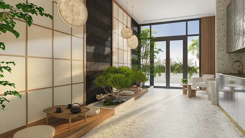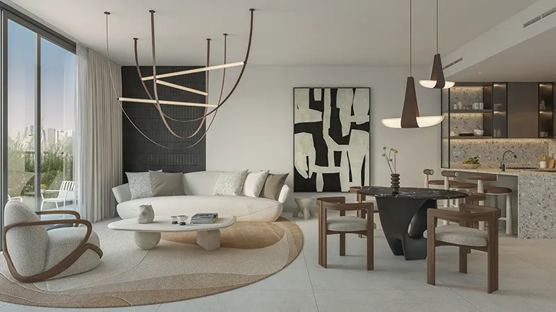 advancement offers an exclusive selection of 138 stunning properties, where every aspect is thoughtfully designed to offer an unparalleled living experience that blends modern aesthetics with functionality and sustainability. The façade enjoys a strategic location within the vibrant Jumeirah Village Triangle (JVT) community, one of Dubai’s most sought-after residential neighbourhoods. The development’s prime positioning ensures that residents are connected to all of the city’s major attractions, making it an ideal choice for those seeking both convenience and luxury. Major highways and transportation hubs are easily accessible, ensuring that residents can quickly travel to any part of the city. The architectural design is deeply rooted in minimalist principles, where every detail has been thoughtfully considered. The use of natural materials, combined with an industrial touch, results in a living space that is both serene and modern. The terracotta touches throughout the development add a warm, earthy feel, while the geometric designs bring a sleek, futuristic appeal. The open-plan layouts of these luxury residences ensure a seamless flow between spaces, with large windows that flood the interiors with natural light. This creates a bright and airy atmosphere that enhances the feeling of spaciousness and connection to the outdoors. These homes are designed to foster a sense of serenity and peace, integrating natural elements such as terracotta finishes with sleek, minimalist lines. The interiors are
