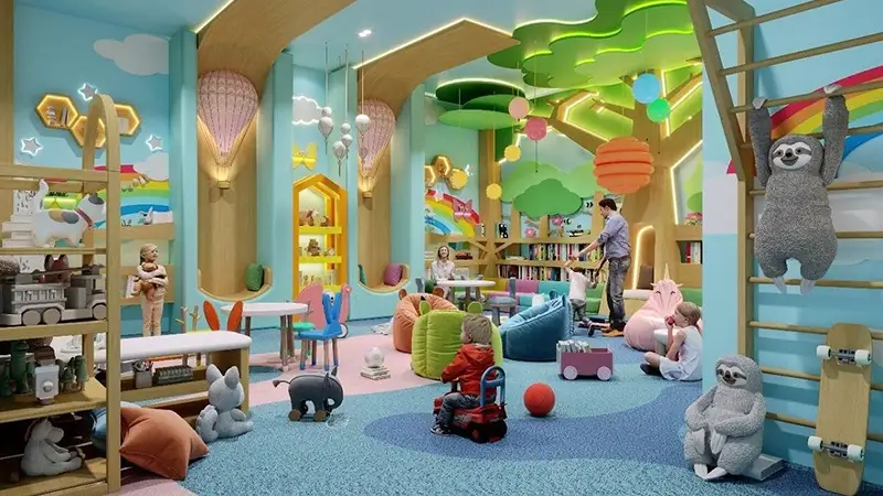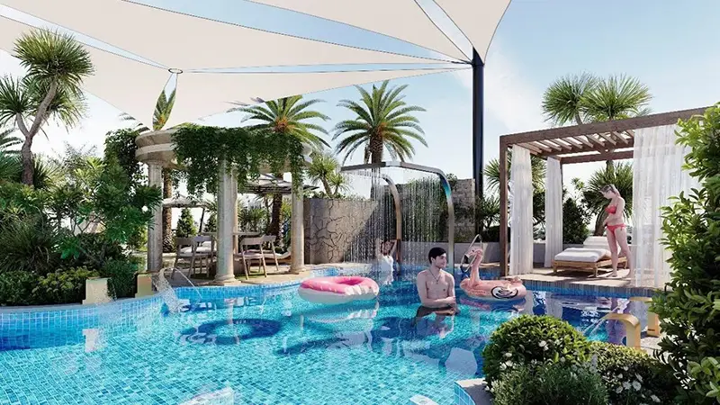 stands tall at 38 floors, offering a symphony of luxury, serenity, and active living. With its meticulously crafted spaces and opulent amenities, it redefines modern living in Dubai. What sets the development apart is its commitment to innovation and technology. Every unit is equipped with smart home features, allowing residents to control various aspects of their living spaces with ease. From lighting and temperature control to security systems, residents can personalize their living experience to suit their preferences. The amenities redefine the meaning of luxury living. The theme park-style amenity floor offers a plethora of leisure options, including a sky pool, waterpark, arcade, private cinema, and mini-golf. Whether unwinding by the poolside or hosting a movie night with friends, residents can indulge in a lifestyle of unparalleled comfort and entertainment. Beyond its luxurious offerings, the location adds to its allure. Situated in the heart of JVC, residents enjoy easy access to major highways, ensuring