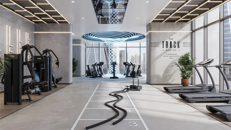 on a wellness-centric podium, offering an array of wellness facilities, retail and hospitality. This vibrant community, located steps away from Sheikh Zayed Road, is set to redefine Uptown Dubai living with its fresh energy, sophisticated facilities and serene views. Situated in the thriving Jumeirah Lakes Towers in the Uptown Dubai District, it exudes an easy-going community vibe. This prime location, set across the renowned Dubai Marina, has become an ideal residential community for families and individuals seeking panoramic waterfront promenades and breathtaking landscapes. With retail outlets, offices, dining, shopping, recreation, and entertainment options, it offers a well-rounded lifestyle. The architectural design seamlessly fuses modern aesthetics with practical living, creating a harmonious and visually stunning environment. The two towers, standing tall at 34 residential floors in the South Tower, with 4 podiums and a basement, are alive with energy and modernity. The interior design is a symphony of soft curved lines, organic shapes, and reflective surfaces that harness natural light to illuminate and soften spaces. Angled mirrors create illusions of dreamlike expanses, while azure blues and metallic accents recreate the effects of sunlight over pristine oceans. The result is an environment that fosters a sense of belonging and tranquility. The façade presents an urban playground offering a plethora of amenities that cater to every facet of a resident's lifestyle. From the upper-level adult gym and spa to the arcade-themed games room, the development is a haven for recreation and entertainment. The infinity-edge pool on the 24th floor,