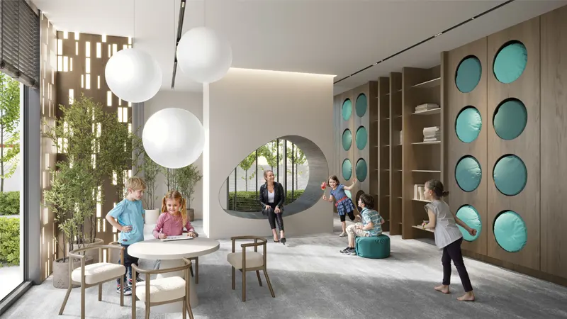 a lifestyle beyond compares. This exclusive development redefines contemporary living, offering residents a harmonious blend of timeless elegance and cutting-edge design. As you enter the enchanting realm, you'll be greeted by a captivating ambiance that permeates every corner of the space. Matte glass panels softly lit from within create a shimmering embrace, while the warmth of wood accents juxtaposed with bold, sophisticated elements exude a sense of refined opulence. Comprising 196 meticulously designed units, it offers a range of living options to suit diverse preferences. Choose from bedroom apartments, each thoughtfully crafted to maximize comfort, functionality, and aesthetic appeal. Beyond its stunning architectural design, the development boasts an array of amenities curated to enhance every aspect of residents' lives. Step into the lobby, where 24/7 concierge service awaits, providing a warm welcome to residents and their guests. Ignite your child's imagination in the vibrant kids' playroom, where laughter echoes and friendships blossom amidst a world of interactive games and whimsical adventures. For those seeking relaxation and recreation, it offers an outdoor swimming pool with poolside sun loungers, inviting residents to dive into luxury and soak up the sun-kissed serenity. Meanwhile, the dedicated kids' swimming pool ensures endless fun and safety for little ones, while the outdoor kids' play area encourages imaginative play